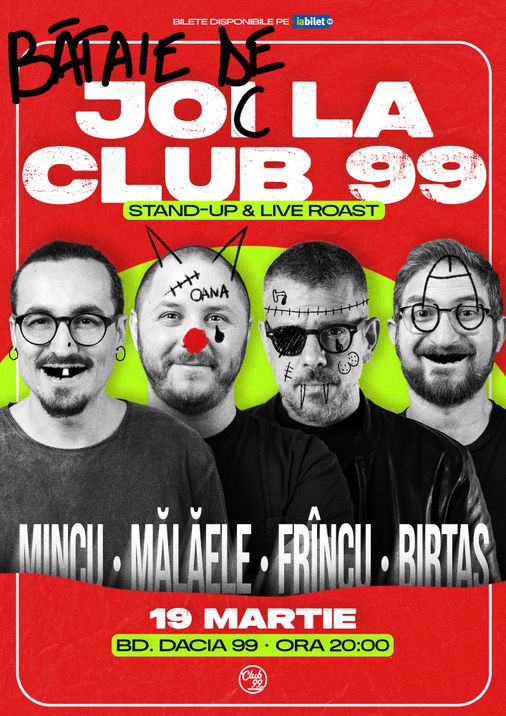 Joi de la 20:00 vă așteptăm la o seară de stand-up comedy și live roast alături de Mincu, Mălăele, Frîncu & Birtaș.