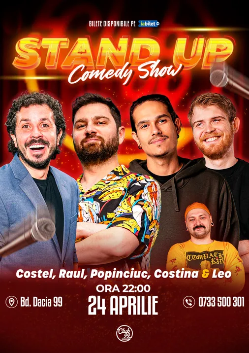 Vă așteptăm la o seară de stand-up comedy alături de Costel, Raul Gheba, Popinciuc, Costina - Leo
