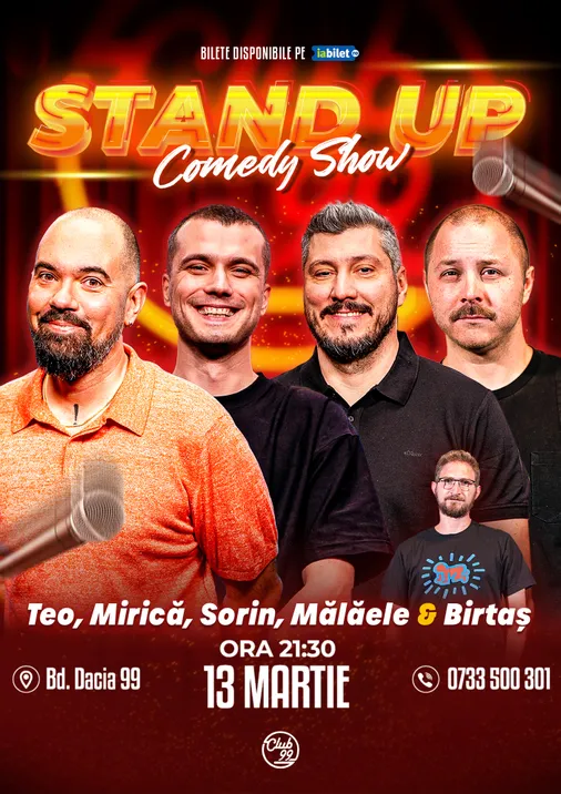 Vă așteptăm la o seară de stand-up comedy alături de Teo, Sergiu Mirică, Sorin Pârcălab, Mălăele - Birtaș