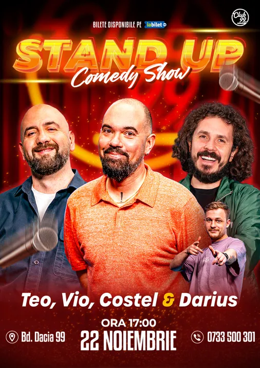 Vă așteptăm la o seară de stand-up comedy alături de Teo, Vio, Costel - Darius Grigorie