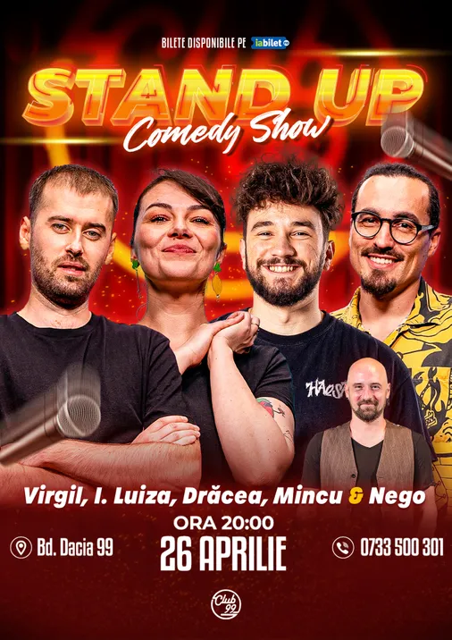 Vă așteptăm la o seară de stand-up comedy alături de Virgil Ciulin, Ioana Luiza, Drăcea, Mincu - Nego